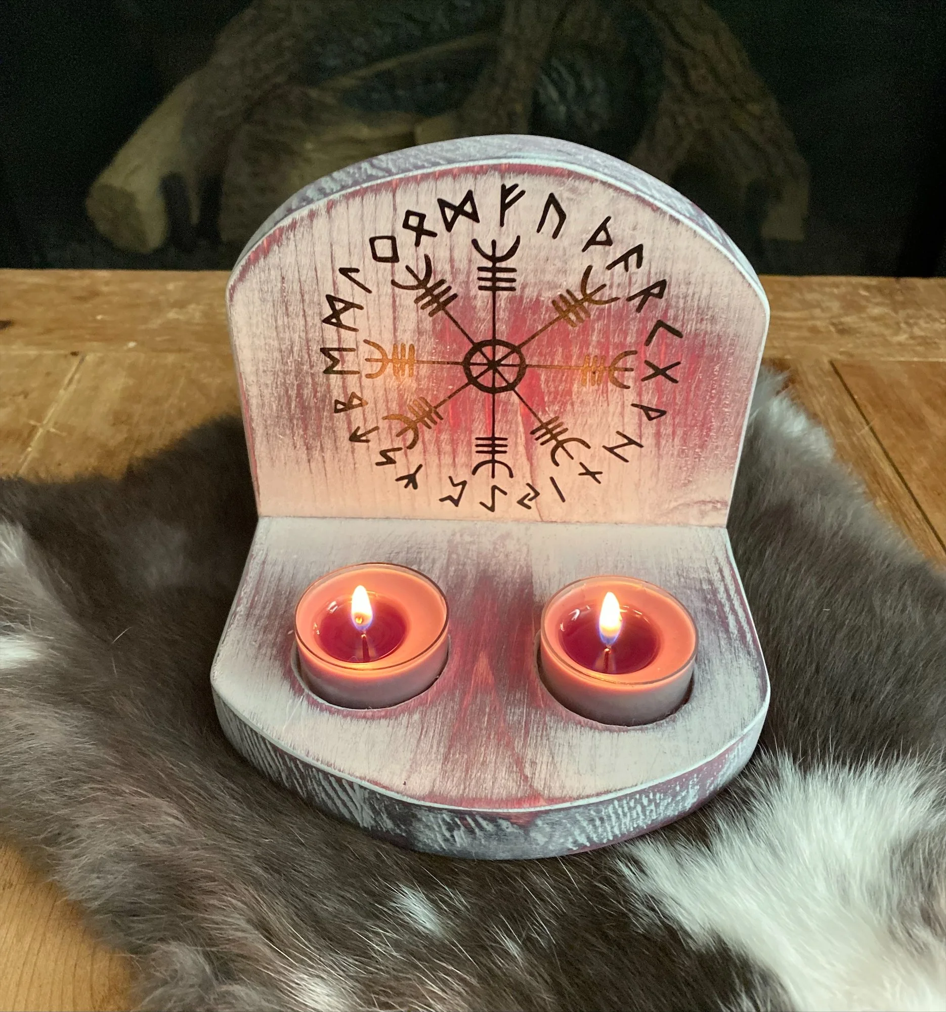 Antiqued Tabletop candle holder / altar piece adorned with the Helm of Awe. Includes 2 tea light candles.